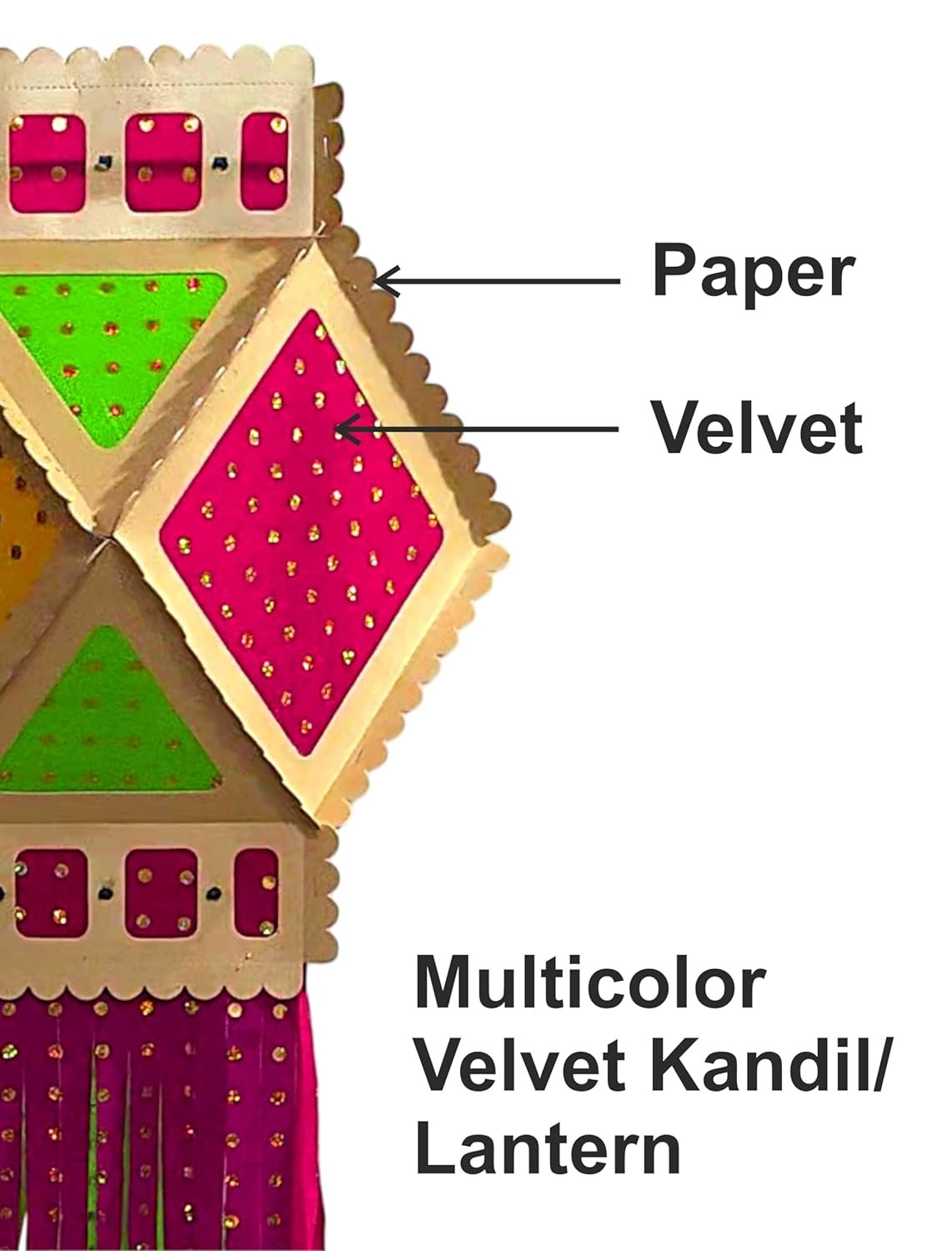 Whether hung in your balcony, windows, or entrance, this kandil enhances the festive atmosphere with its radiant charm. The velvet texture combined with shiny reflective detailing adds an elegant touch, making it the perfect choice for those who appreciate both tradition and modernity in their Diwali celebrations.